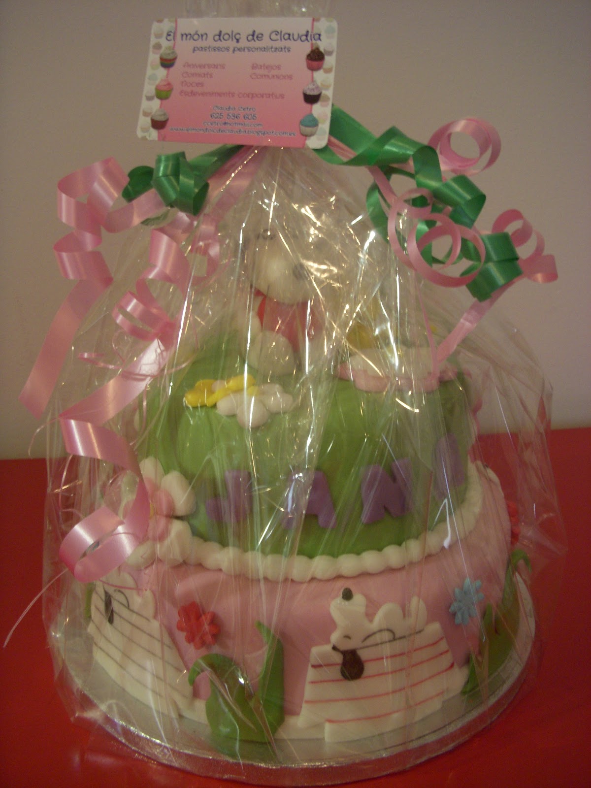 Janaina quería una tarta de Snoopy. Hice 2 bizcochos, uno de buttermilk aromatizado con vainilla y relleno con nocilla y oreo triturada y dulce de leche. El otro fue un bizcocho de mantequilla, relleno con buttercream de merengue suizo. La decoración la hice con mi sobrina Janaina, que le hacía ilusión ayudarme a hacer su tarta de fin de curso.